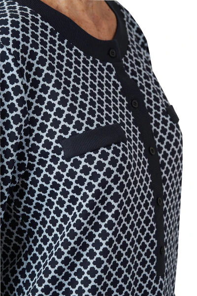 A lightweight knit with a jacquard pattern, accented by lightweight rib trim at the collar, front placket, and faux pocket welts. It features a wide open-back design with snap closures for easy and secure wear.
