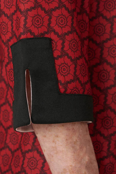 A lightweight knit featuring a delicate, abstract floral pattern, accented with contrasting trim at the collar and sleeve edges, and designed with a broad open-back detail secured by snap closures.