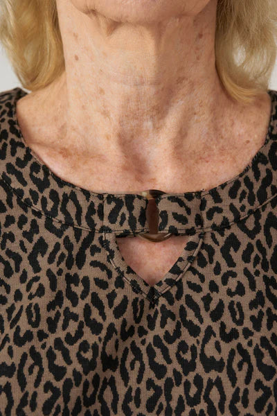 Leopard jacquard knit featuring a keyhole detail and ombré loop, with 3/4 sleeves. A full back opening allows for easy, assisted slipping on.